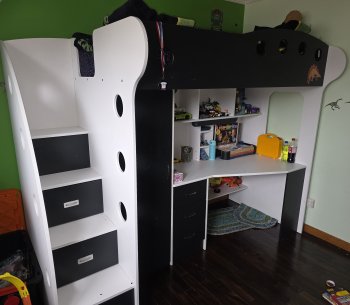 Twin sized loft bed with desk/drawers, 3 drawers in stairs, built-in closet for hanging clothes. Overall depth 42", height 76", width 95".