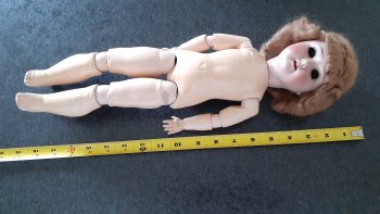 Schoenau Hoffmeister 18" doll. Bisque head, composite wood ball jointed body. Logo on back of head is "S, a star with PB inside it, H" , 1909, 1 1/2, Germany. Good Condition for age