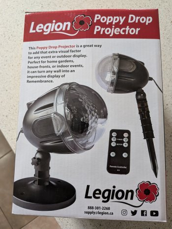 Indoor/Outdoor Projector features dropping red Poppies, Green evergreens, blue snow flakes, Red Maple leaves,