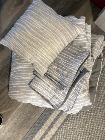 Gray/white king size comforter, comes with matching pillow shams, decorative cushion; in excellent condition; only used for 1 winter. Smoke free, pet free home.