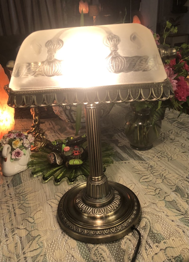 Images: Mid Cent Bankers Brass LampOrnate FrostedEtched Glass Shade