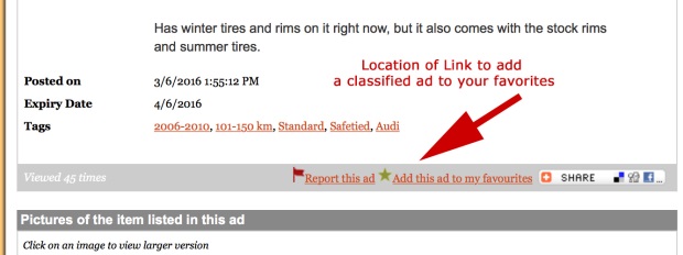 You’ll notice that on each ad on the website there’s now a “Favourite” link/star icon (added a picture to this thread as a sample). As long as you have a registered eBrandon account and are logged into that account, you’ll be able to click on that new link on any ad to easily add it to your favourites list. If you don’t have an account its as easy as clicking on the Signup link at the top of the page.