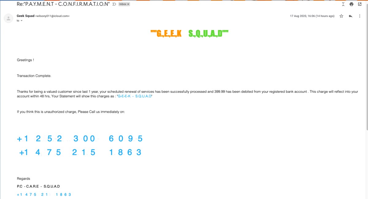 I received a scam email yesterday afternoon, which you might want to be aware about. The mail comes from someone pretending to be from GEEK SQUAD, and informs you your account will be debited $399 for a "renewal of services." Looking over the email carefully, I noticed there was no invoice number, no tracking number for any "merchandise" shipped, no business addresses, simply two telephone numbers, one of which is a mobile (cell) phone customer. And no funds have been debited from my bank account. I THINK this is phishing scam, and I won't be calling the telephone numbers: this is designed to throw one into a panic as it nearly did me. However for safety's sake I changed the password on my banking site and cancelled my bank's branded debit card for internet transactions. Screenshot of the email I received is posted.