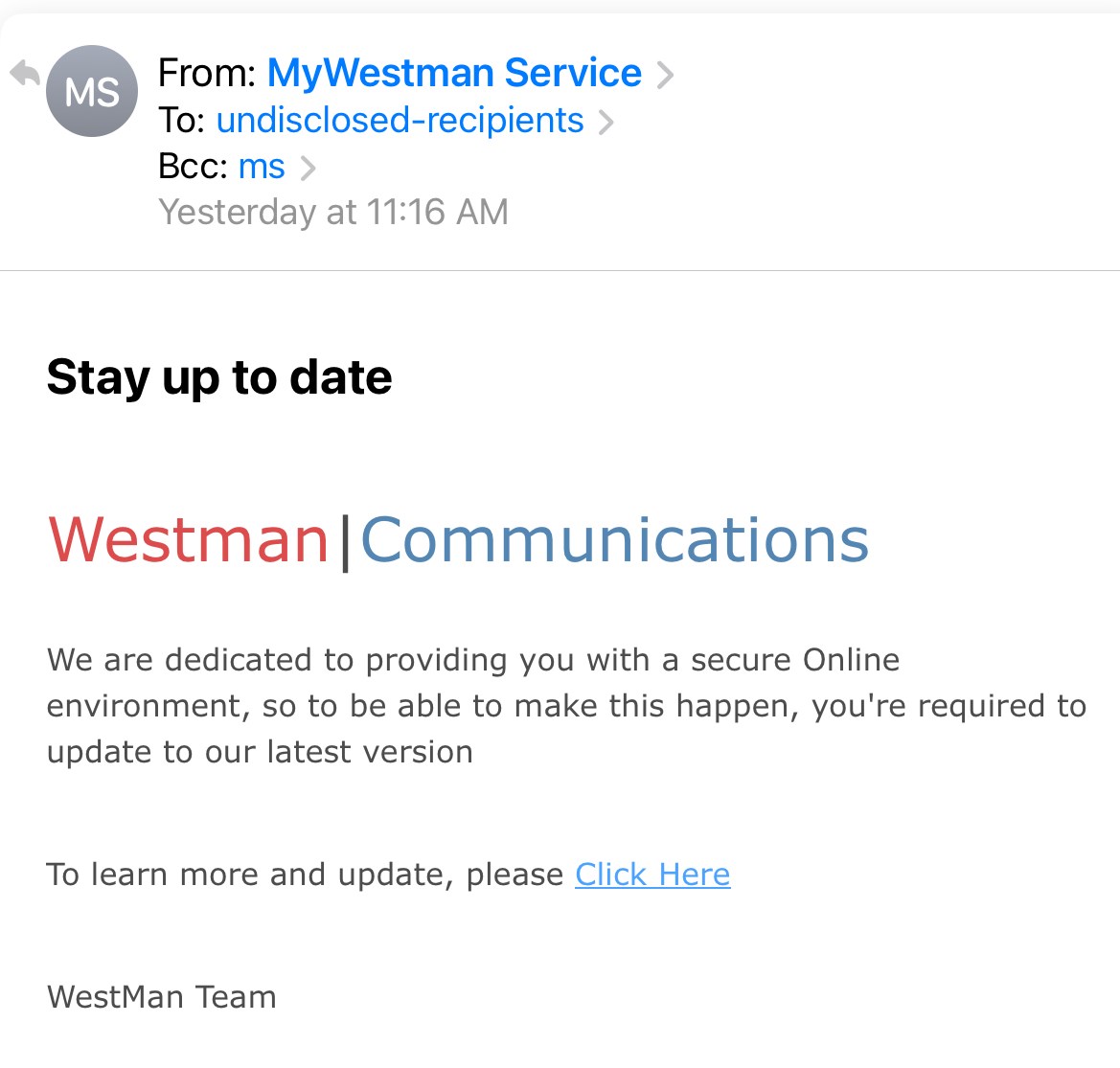 I received this message yesterday. The return email address is marycody12345@gmail.com. I did contact Customer Support at Westman Communications to alert them.