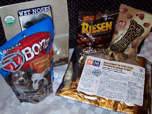 TBonz steak flavour snacks, so chocolate treats and snacks for you... AND people flavor treats - Bacon wrapped sirlions from M&M Meats