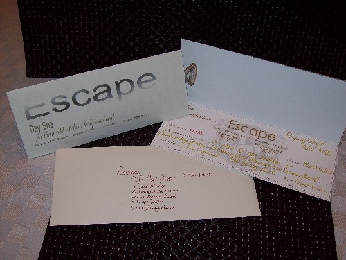 - complete prize package from ESCAPE DAY SPA & ESCAPE TANNING SALON (water massage,Journey of the Sense, Pure Essence facial, 10 Spa Dollars & 100 tanning points) value over $150
