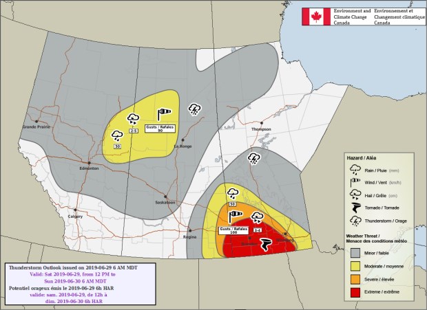 New forecast maps issue by Environment Canada suggest the strong possibility of all modes of severe weather for a large swath of Southern Manitoba On June 29.