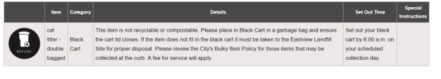 I also have issue with putting feces in the landfill, whether it be from pets (dog poop or cat litter) or people (i.e. diapers). Ideally, that should all be going into the sanitary sewer so it can be treated instead of risking the spread of pathogens.