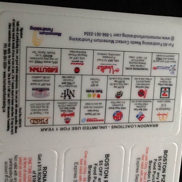 I added pictures of the Crocus cards, front and back. It’s a lot of the same deals as last year, BOGO deals for Freshii, free slurped, free 7/11 pizza, 10% off at Shopper’s Drug Mart and Source for Sport, and lots more!