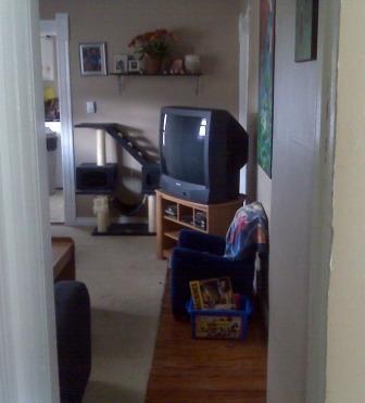 I am trying to make my livingroom as 'homey' as possible but need ideas on how to draw it together. You can't see the couch from this angle but I want to get a slip cover for it but am not sure what color, etc....