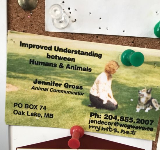 I just added a picture of a business card for an Animal Communicator. Jennifer Gross in Oak Lake. Is this the type of thing you’re looking for? I don’t have any other information on it other than what is on the business card.