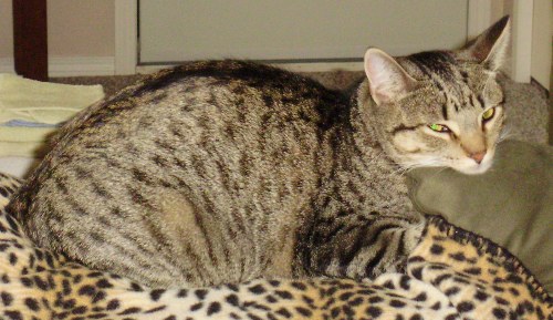 He's a beautiful brown tabby male with a tattoo in his ear. His name is Brew, also answers to BrewBrew, superfriendly, but may be scared and hungry. (Hint, he likes Temptations...in the green bag..haha!)