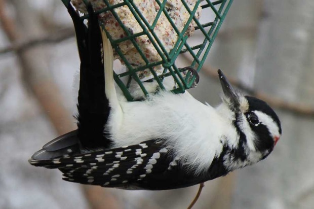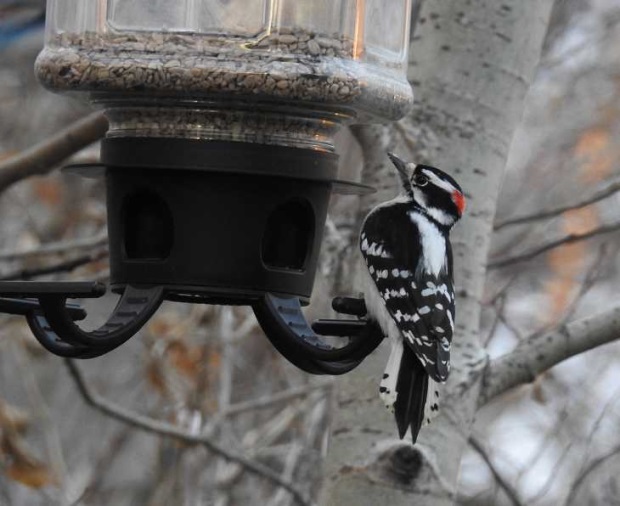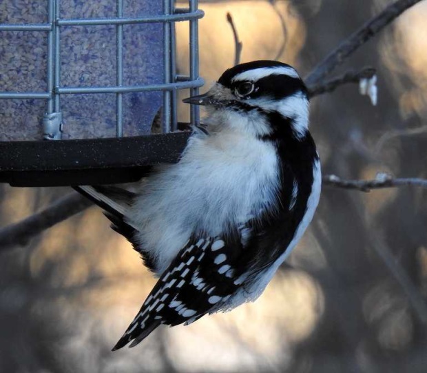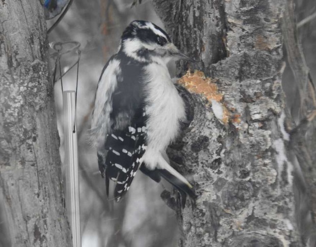 Ok, the little fellow was back today, and thanks to your link, it is definitely and woody or hairy woodpecker. ill need to due more looking. his beak looked quite big, so im thinking a hairy. but ill check tail feathers next time.