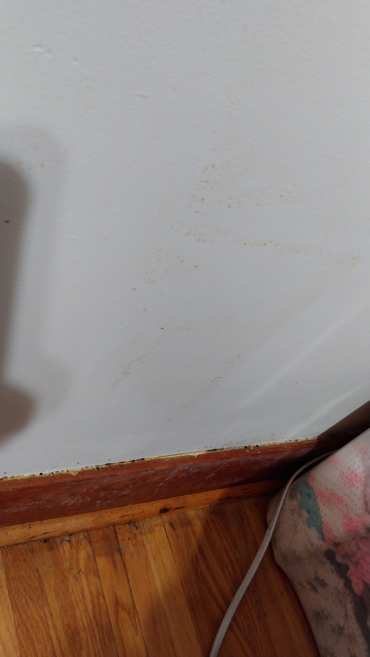 The tenant is to keep the apartment or suite clean and tidy at all times, that means cleaning the walls. That picture to me looks like something was on the outside wall, with an older building (can tell it is older from the moldings) there will not be much insulations in the walls so anything up against the walls may cause frost on the inside walls and then cause mold!