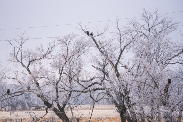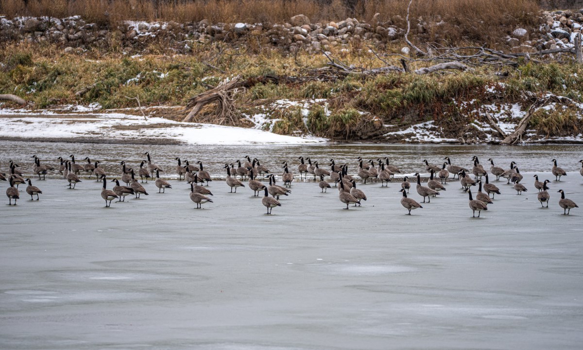 No sign at lunch anywhere from Grand Valley Road through to 1st street that I could see. If they're still around, best bet is to go for a drive and follow the river as best you can even going as far as Rec Centre where I caught one on the banks near the new Riverside development. Have a spotter keep an eye toward the top of taller trees near the riverbank (unmistakable big black blob in a bare tree) and up in the air near the river (by far the biggest anything you'll see flying unless the Westjet flight happens to be on the way in