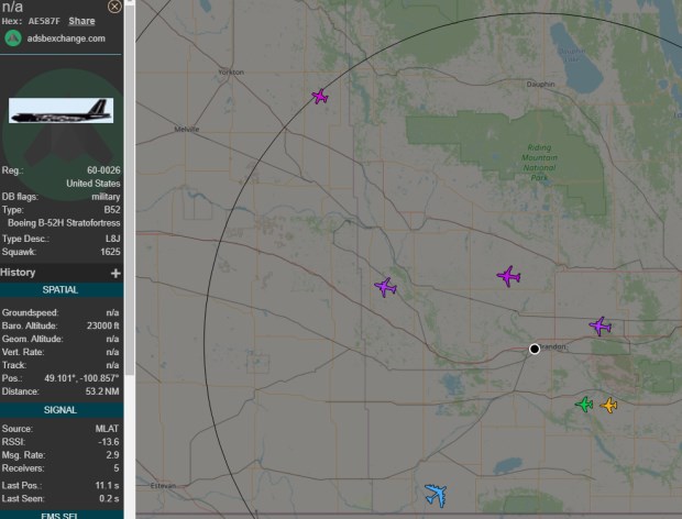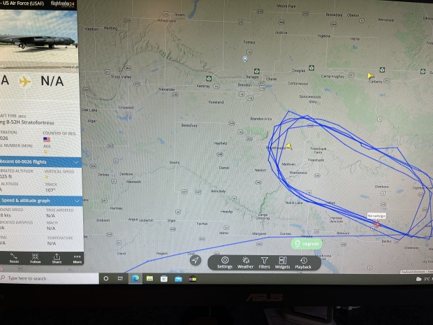Adam said "Not from any base or military contact, but am told that B52 seen in the Southwest headed (back?) toward Minot direction. Circumstantial stuff and I know base contact told me it shouldn’t be them based on distance away that training is today, but what we’ve seen in post above is still most plausible explanation I’ve seen so far. "
