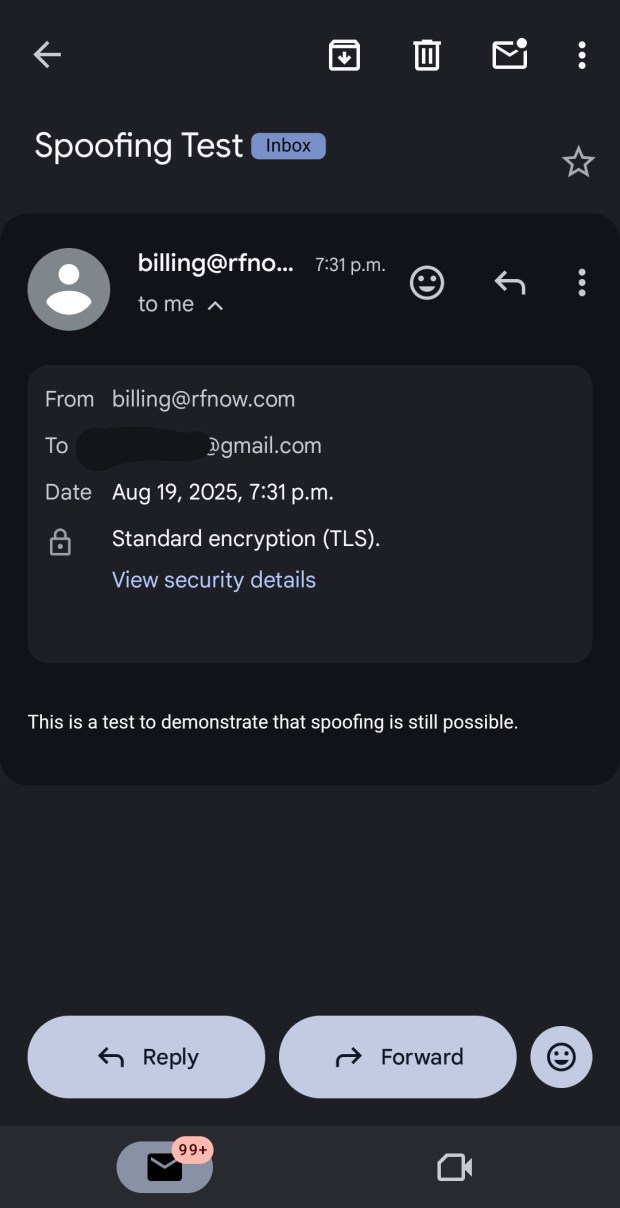 There is a long-standing email security vulnerability affecting RFNow’s mail server. It allows anyone to send spoofed emails that appear to come from official RFNow addresses like billing@rfnow.com. These emails are received by major providers (like Gmail) as if they were legitimately sent and signed by RFNow.