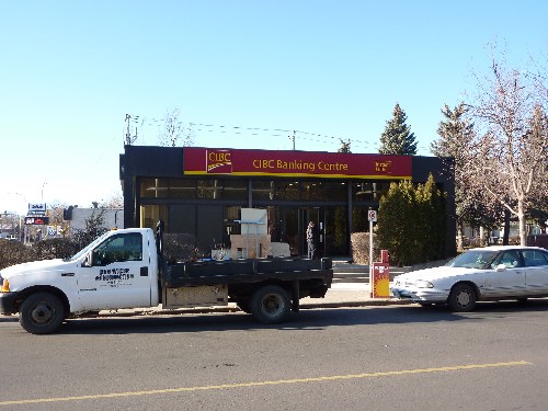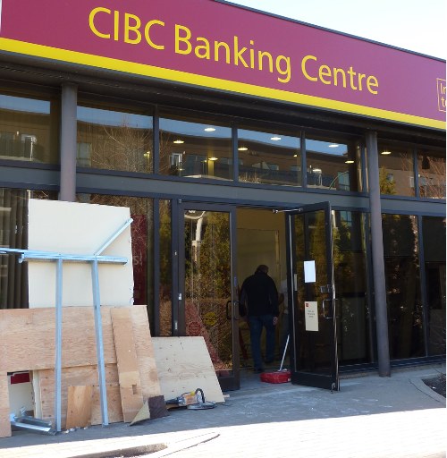 The CIBC across from Superstore has what appears to be a smashed glass door. A bunch of vehicles on site. There are stairs going up to the front door so it seems pretty unlikely that a car hit it (again...)