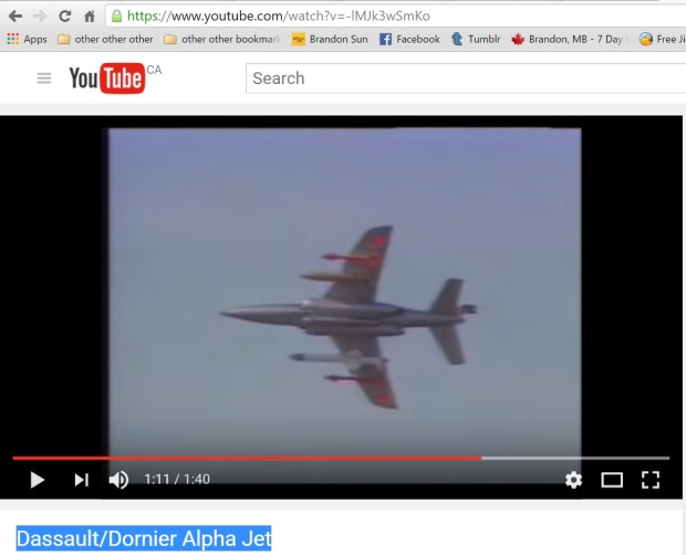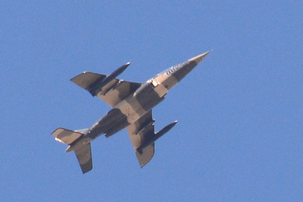 I am not 100% convinced that the picture Adam took is an Alpha Jet. It could be but just not convinced. The large white missile under the right wing is a Harpoon missile used for anti-shipping. As far as I know, there are no oceans within flying range of this jet. And are those red stars on the wings!! That would make this a Russian fighter.