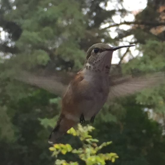 It sure sounds like you have a Rufous. It’s not that uncommon for them to wander in all directions away from the mountains. They are the one species that tends to do this more than any other. I would just suggest to keep a feeder out for her. In her time she will move on, and I’m pretty sure it’ll be soon. I also had a reported Rufous last year in the central prairies in early October.