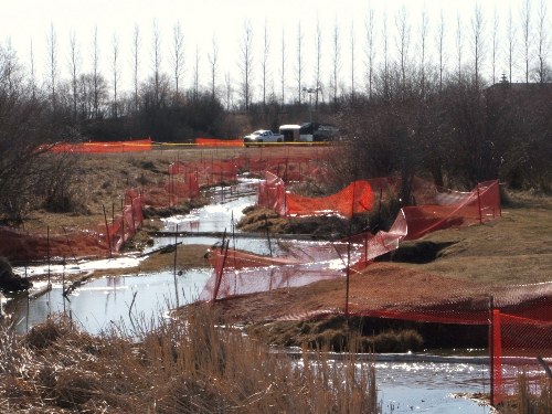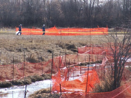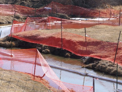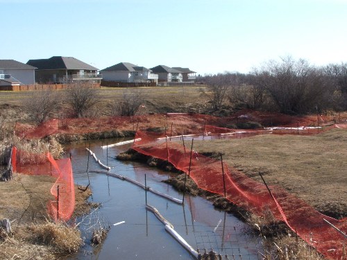 I noticed some activity along the Bosshill Creek in Virden this afternoon: a crew was working hard to contain an oil spill.
