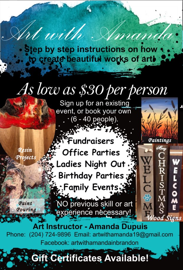 Feel free to text or call 204-724-9896, email artwithamanda19@gmail.com or contact me through Facebook for more information.