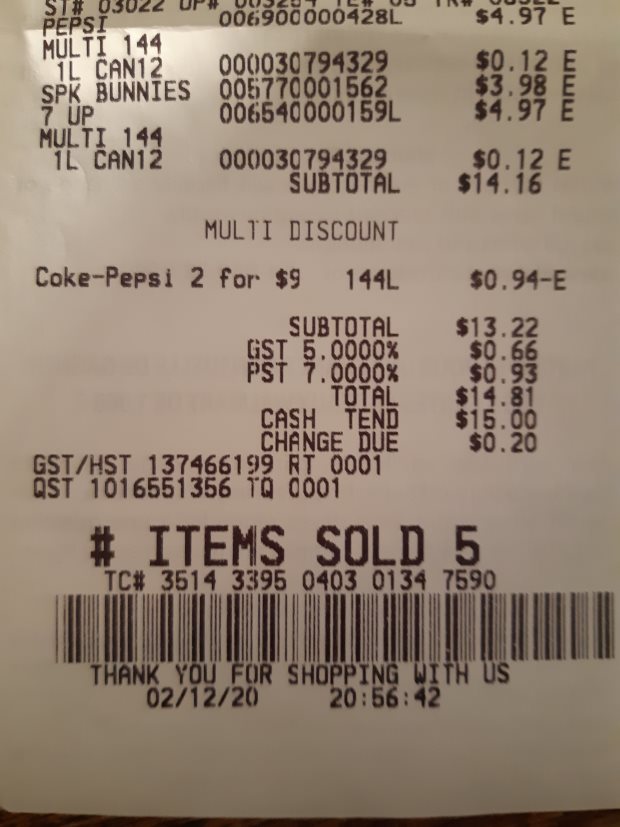 As you can see your net price in Sask is about 62 cents more, thanks to the deposit system.