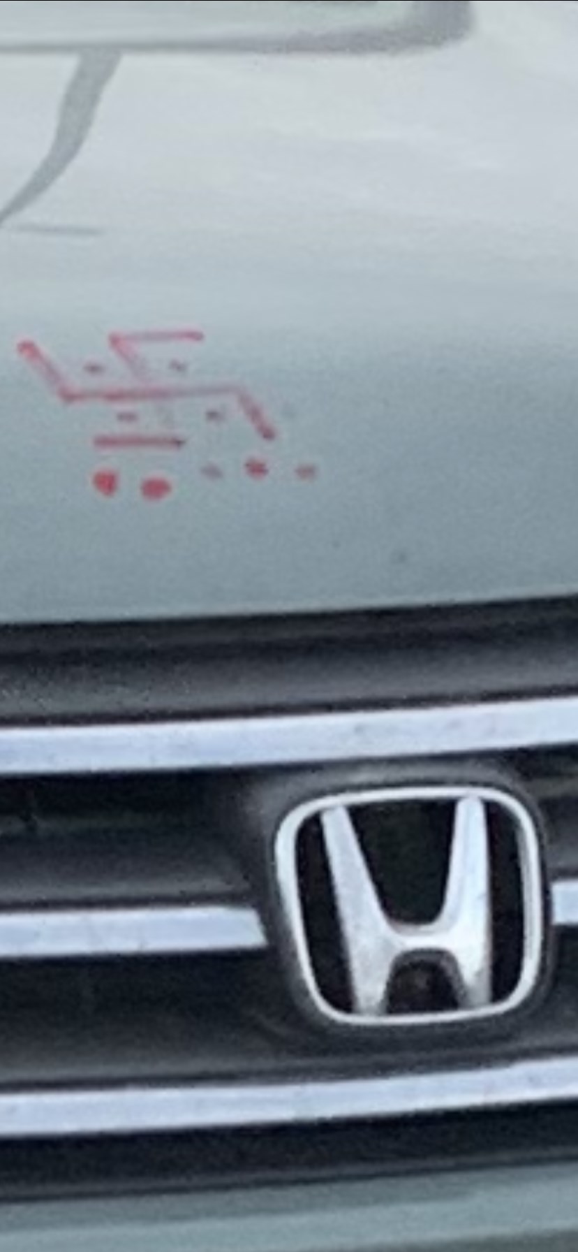 I was shocked to see this on a hood of car in dollar store parking lot across from Walmart. It was painted on. I had to secretly take a picture as there was men inside.