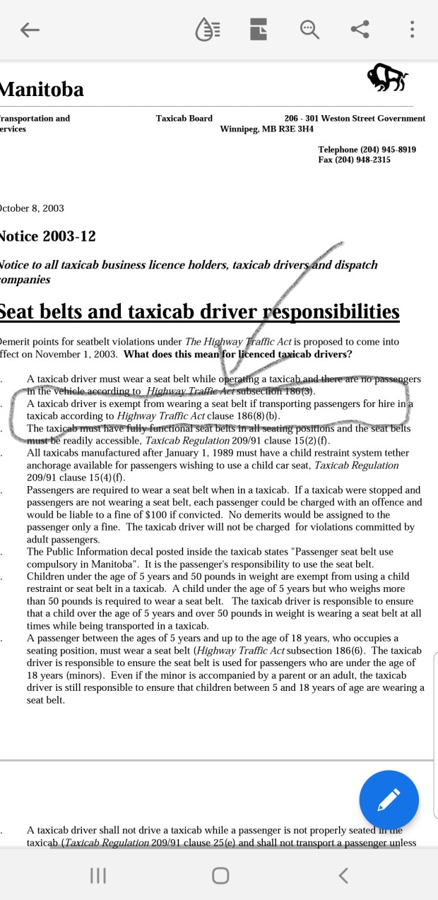 So because it's written on old Government of Manitoba letterhead you think it's valid? I hate to break it to you but The Highway Traffic Act supercedes any letter some taxi cab board wrote almost 20 years ago.