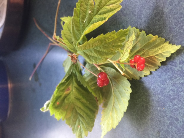 From as far as I can tell, it's not anything that is recognized as a wild edible berry in Manitoba. It's definiately not highbush cranberry (the leaf shape is wrong). It's also not a nanking cherry (also doesn't grow as drupes, but as single berries) or currants (leaf shape is wrong). It's also not a chokecherry (wrong colour) or a pincherry (wrong leaves again).