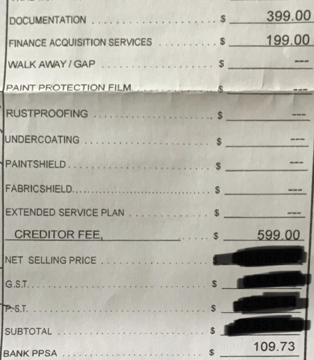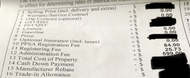 Obviously if you add things to the sale such as an extended warranty, winter tires, accessories etc. then that isn't what the law is about, those are add-ons and not i:ncluded. But when they say dealer fee of $500 applies but don't worry that i:ncludes tire damage or something like that. I'll be very clear, total BS, they are selling you a tire damage warranty worth $50 for $500 and is a crooked practice. Or if they try and charge you a PPSA fee of $700 it is also a crooked practice. The PPSA fee is something that's a cost of doing business for dealers when they finance, it's a few dollars a year to register a lien with the Government of MB. Some dealers take advantage of people and say it's financing fees and mark it up 500% and tack it on the bill. And the usual thing is it's a standard fee everyone pays it.