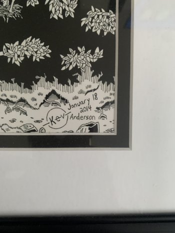 18 X 24 signed, dated and professionally framed art from Late Ojibway artist Kevin Anderson. Awakening the Giants depicts ?An unforgotten age when man could communicate with the animals and Earth as we are the guardians it will awaken again? Would look great in any Office or Living Room