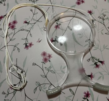 Has an adjustable neck cord for hands-free use; great for reading or crafts. Has little feet too. Super useful!