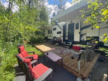 Currently parked at a seasonal site in Outpost Campground. A deck has been build around unit and permanent plumbing has been installed. Campground lease is paid to April 2026 and if buyer would like to keep site, more info can be provided and ownership can be transferred at no extra cost.