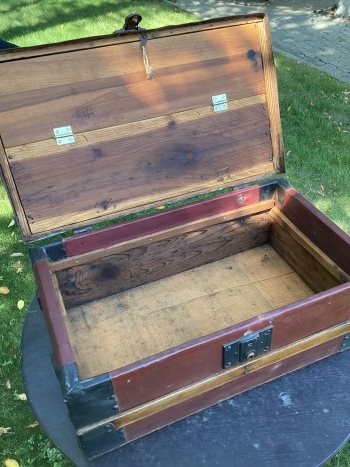 IT HAS AN UNUSUAL COMPARTMENT IN THE LID, IT WAS PROBABLY FOR PAPERS ETC.