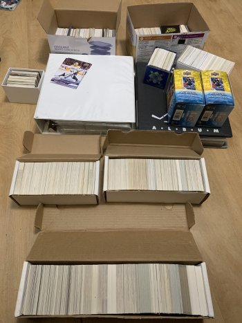 I’m selling my hockey card collection, contains about 7500 cards. There are lots of newer and older cards, Tim Hortons, Upper Deck, Young Guns, and lots more. It also includes some card supplies like sleeves and top-loaders. I will consider reasonable offers. Text or email only please.