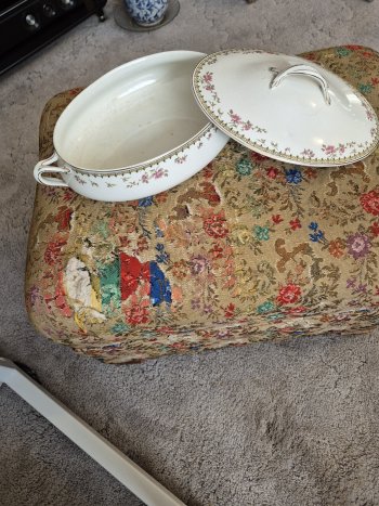 White oval tureen with lid. White and pink roses trim. Etched with gold