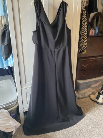 Elegant black wrap dress with POCKETS! Brand new, never worn. Material is thicker, not flimsy or filmy, cocktail length in front and long in back.