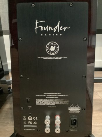 Paradigm Founder 120H 5-Driver 3 Way Hybrid Floor Standing Speaker in Midnight Cherry. High-Frequency Driver: 1" (25mm) AL-MAC Ceramic Dome with Oblate Spheroid Waveguide (OSW) and Perforated Phase-Aligning (PPA) Lens, ferro-fluid damped/cooled