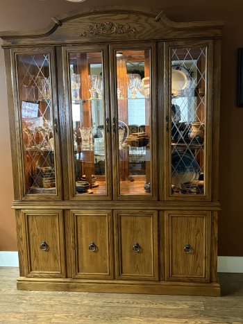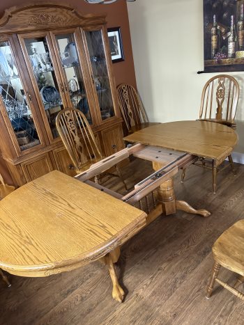 Downsizing. Oak oval dining room table, 6 chairs and 2 captain chairs, 2 x 18” table leaves, full size china cabinet with interior light (contents not included). Perfect for large gatherings. Table expands from 5 feet to 8 feet by gears and can be done by one person. Very good condition. Will sell separately (table and chairs / china cabinet). Cash or etransfer confirmation upon pick up only.