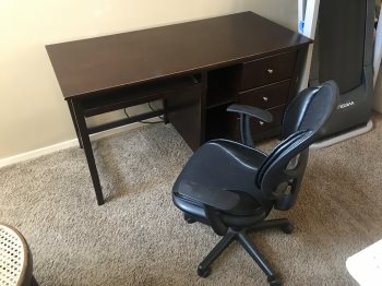 Chocolate brown office desk with file drawer and pull out keyboard slide. Complete with chair.