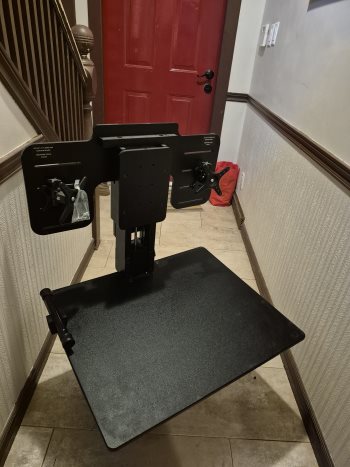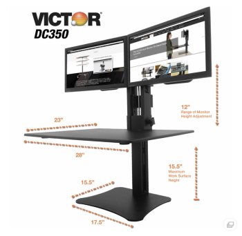 Product Description: The DC350 High Rise Dual Monitor Sit-Stand Desk Converter is simple solution to a common workplace problem: too much sitting. Transform any sit-down desk into a sit or stand desk. It allows two monitors with a maximum width of 22" each (24" diagonal). Gas strut design allows easy custom height adjustment of both desk and monitor from zero to 15-1/2". Worksurface with sleek wood construction and durable laminate coating lowers to become flush with desktop level. Extra-large worksurface provides plenty of room for accessories. Heavy steel base prevents tipping. Riser has a no clamp so it offers a damage-free design.