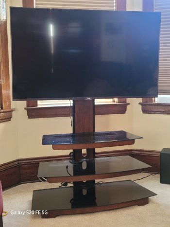 Whalen tv/entertainment stand. Has 3 glass shelves, adjustable up and down with swivel.