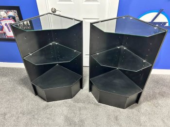 2 corner display shelves. Great condition from smoke free home. Adjustable glass shelves. 38? tall x 18? out from the corner. $75 for the pair - not heavy but must be able to move them yourself.