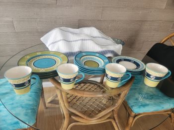 4 piece set of stoneware, in like new condition. Only used a couple times. Living Art by Stoneage stoneware, dishwasher and microwave safe. 4 dinner plates 10 3/4", 4 salad plates 8", 4 cups, 4 soup bowls. FCFS, ho holds, pick up only. Smoke free home. $40 for the set. Call/text 204-761-1069.
