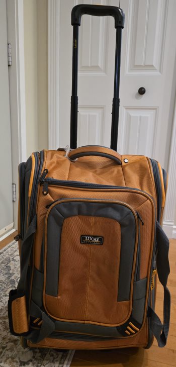 Lucas luggage original. Approx 24 high and 17 wide. larger main compartment, 2 long side compartments, & a compartment on the front of the bag. 2 wheels, pull handle, carrying handle on the top plus lift or carry handle on the front. Used once for a trip, no longer needed.