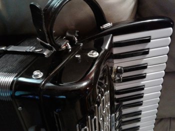 TITANO ?Stroller? 120-Bass Accordion w/case, w/ twin durable straps, ?? volume output and volume & tone control knobs, 4 Bass Buttons, 7 Treble Buttons, Organette ? Tube Chamber (Bassoon, Bandoneon, Organ, Harmonium, Oboe, Clarinet and Piccolo). Made In Italy SN: 44631. Case & Instrument are in very, very good condition.