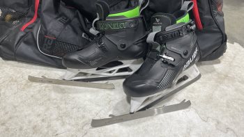Skates are basically brand new, he grew out of them in less than a season. Comes with an extra set of blades one set is titanium. Size 8 $500