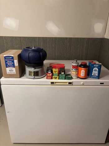 Lots of reloading accessories including cabinet, press, bullets, primers, brass, dies, etc.