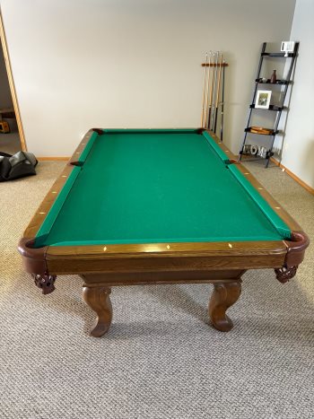 This is a slate custom built pool table from Jordon billiards a beautiful piece of furniture they built it for me 25 years ago and they are still going strong. It will be professionally dismantled and set up by Jordon billiards. It comes with everything you need to get playing light cues and holder cover balls chalk. I'm selling for 1/2 of original price just to move fast our children have purchased our Ranch and would like to have it moved as soon as possible it is 4x8.
